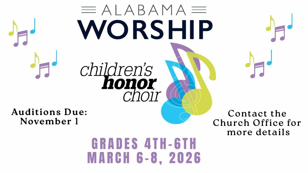 Alabama Worship is currently accepting applications for 4th-6th graders to audition for the Children's Honor Choir. Applications and audition recordings are due by November 1. If your child is accepted into the Honor Choir, a camp will be held at Shocco Springs March 6-8. Cost to attend is $225 with a $50 deposit due by January 1. More information and the full application are available by clicking here, or visit alabamaworship.org.