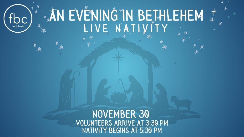 Join the cast of the Live Nativity! One night only, Sunday, November 30! We ask all volunteers to be at church by 3:30pm. We will have a rehearsal at 4pm, followed by supper. The event opens to the public at 5:30pm and goes until the last car exits! Kick off the Christmas season right by being a part of this beautiful celebration of the birth of Christ! Sign up below: