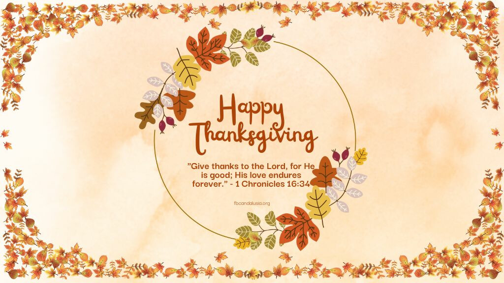 Enjoy the Thanksgiving Holiday with your family! We'll see you next Wednesday, December 3rd, fellowship supper at 5pm, followed by Bible Study groups for all ages!