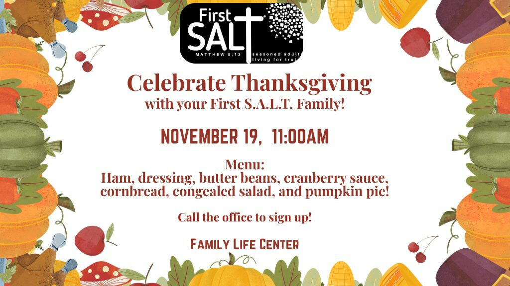 | Rm. Family Life CenterCelebrate the Thanksgiving season with your First S.A.L.T. Family! Come enjoy a wonderful meal while fellowshipping with friends and family. After lunch, we're...